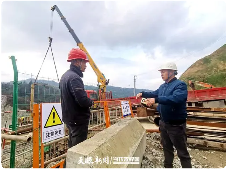 鳳山水庫工程建設(shè)管理部工程管理室主任簡杰(右)和工程人員進行施工交流。